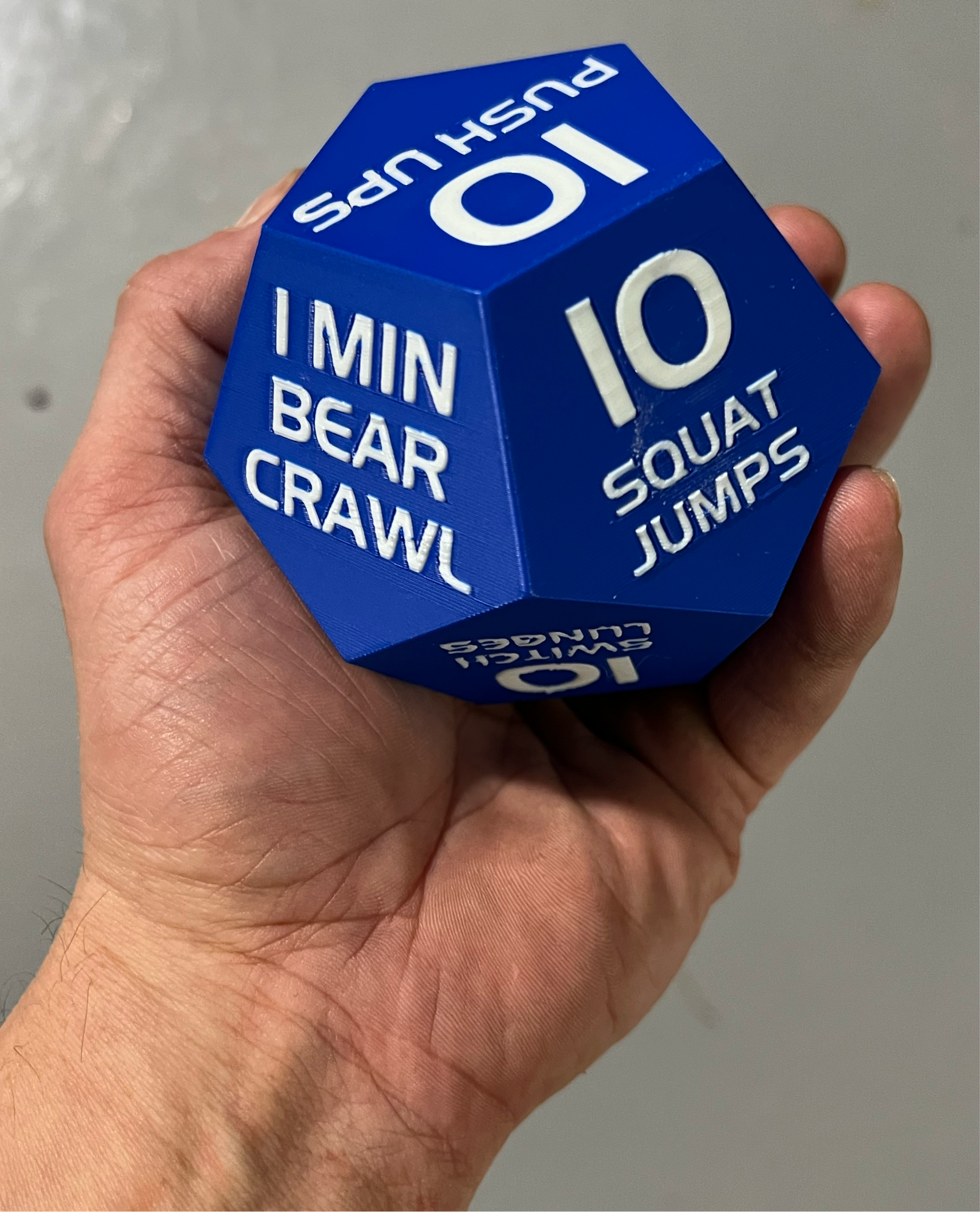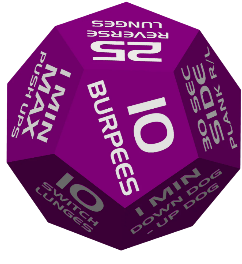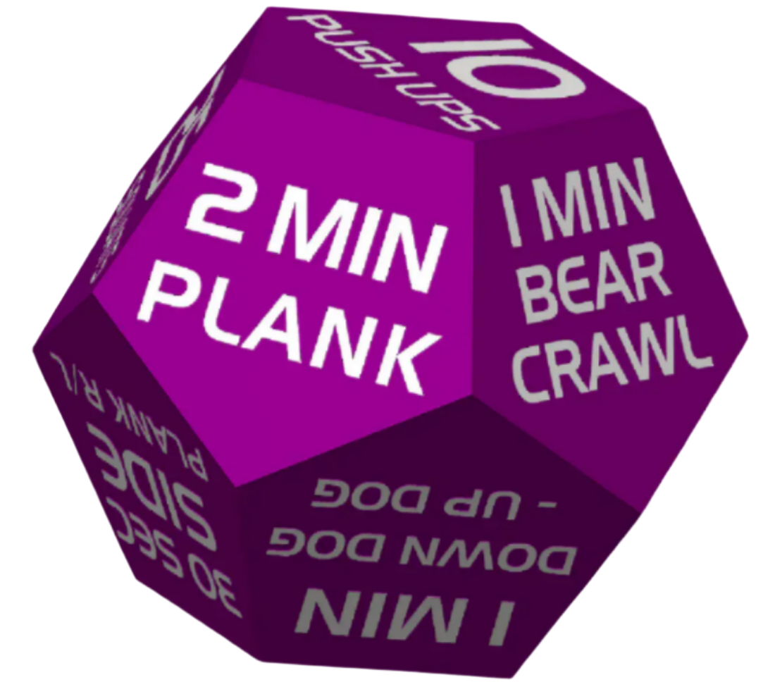Set a timer and roll the die! Exercises designed to make you stronger. A great addition to any gym bag.